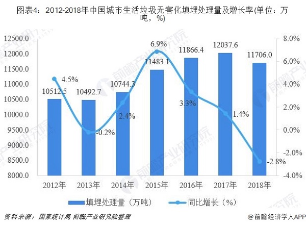 目前,我國城市生活垃圾處理還是以衛(wèi)生填埋為主,但焚燒處理量與衛(wèi)生填埋處理量之間的差距在逐步縮小。我國使用衛(wèi)生填埋手段最主要的原因是填埋法技術(shù)比較成熟,操作較簡單,而且處理量大,投資和運(yùn)行成本費(fèi)用較低,和我國現(xiàn)階段的發(fā)展?fàn)顟B(tài)和技術(shù)水平有較大的關(guān)聯(lián)。2018年,我國衛(wèi)生填埋垃圾處理量為11706萬噸,同比減少2.8%。
