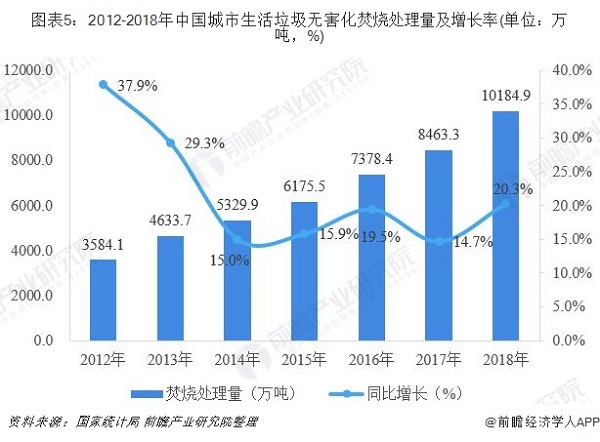 目前我國生活垃圾處理市場增速放緩,整體空間有限,但垃圾焚燒發(fā)電行業(yè)仍處于快速增長的時(shí)期,其主要原因在于垃圾處理方式的結(jié)構(gòu)在發(fā)生大的轉(zhuǎn)變,許多填埋處理量將逐漸被焚燒方式所替代。目前,生活垃圾焚燒發(fā)電項(xiàng)目已遍布全國各省、直轄市、自治區(qū),垃圾焚燒發(fā)電項(xiàng)目主要集中在華東、華南地區(qū)。2018年,我國焚燒處理垃圾量為10184.9萬噸,同比增長20.3%,增速明顯高于衛(wèi)生填埋。