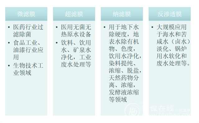 依據(jù)孔徑的不同(或稱為截留分子量的大小)可將膜分為微濾(MF)膜、超濾(UF)膜、納濾(NF)膜和反滲透(RO)膜等。按照不同應用領域來看,超微濾膜與反滲透膜更為常見。其中超微濾膜主要應用與污水處理和中水回用、給水凈化及海水淡化的水預處理階段;反滲透膜則可有效脫除溶鹽和部分有機物,對懸浮物的脫除更徹底,出水水質(zhì)可達飲用水標準,主要應用于脫鹽、超純水制造、海水淡化處理。