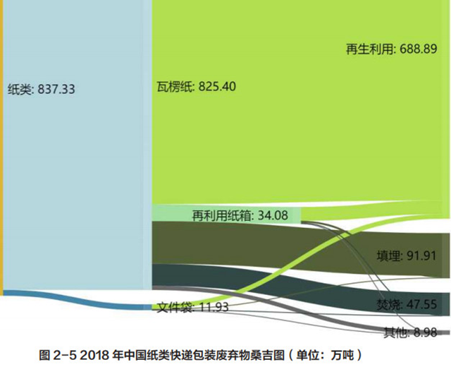 調(diào)查發(fā)現(xiàn)快遞紙箱類包裝廢棄物只有不到 5% 被重復(fù)使用,按重量計(jì)算約有 80% 的紙箱被回收,還有約 15% 混入生活垃圾。以 2018 年為例,我國快遞行業(yè)共消耗紙類包裝材料 837.33 萬噸(不包括快遞單號紙),其中文件袋用紙 11.93 萬噸,瓦楞紙箱、紙筒和膠帶芯等瓦楞紙消耗量 825.40 萬噸。這其中僅有約 34.08 萬噸的瓦楞紙箱被重復(fù)使用,通過流動回收業(yè)者回收的約有 688.89 萬噸快遞包裝廢紙(瓦楞紙 679.43 萬噸,文件袋 9.46 萬噸)。計(jì)算得到快遞紙類包裝產(chǎn)生量和流量信息如圖 2-5 所示: