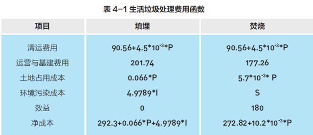 本文中的生活垃圾處置成本包括收集、運(yùn)輸、轉(zhuǎn)運(yùn)和處理成本,其中,垃圾處理相關(guān)費(fèi)用包括:垃圾清運(yùn)成本、運(yùn)營和基建成本、土地占用成本、環(huán)境污染成本和效益,具體單位處理成本見表 4-1。垃圾填埋的環(huán)境成本包括垃圾填埋場主要的污染源——垃圾滲濾液的環(huán)境污染成本。焚燒處理的環(huán)境成本系通過疾病成本法來核算二噁英致癌成本。效益指垃圾焚燒發(fā)電收入;