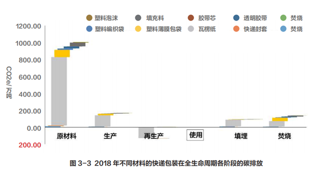 從圖 3-2 和圖 3-3 中可知,在 2018 年我國快遞包裝材料在生命周期各階段中(不包括再生),原材料階段(71.56%)的碳排放所占比重最大,處置階段占比重較小(焚燒 9.79%,填埋6.68%),生產(chǎn)階段(11.97%)占比最小。