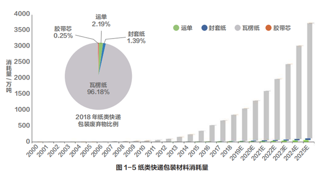 本研究采用物質(zhì)流分析方法,研究表明,我國各類快遞包裝材料消耗量從 2000 年;的 2.06 萬噸增長到 2018 年的 941.23 萬噸。若不施行有效的措施予以控制,依當(dāng)前快遞行業(yè)的發(fā)展趨勢,2025 年我國快遞包裝材料消耗量將達(dá)到4127.05 萬噸,帶來龐大的資源負(fù)擔(dān)和環(huán)境壓力。按照材質(zhì)類型,可將快遞包裝材料分為紙質(zhì)類和塑料類。2018 年我國共消耗紙質(zhì)類快遞包裝材料856.05 萬噸,占快遞包裝材料的 90.95%,塑料類包裝材料85.18萬噸,占快遞包裝材料的9.05%
