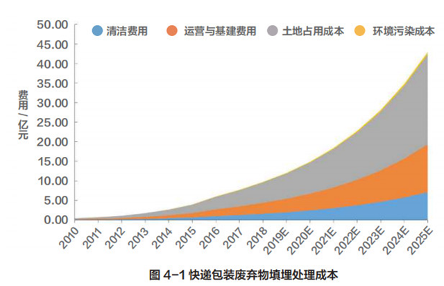 生活垃圾社會管理成本是社會在生活垃圾管理各環(huán)節(jié)承擔(dān)的可識別的以市場價核算的成本。在中國特大城市中,快遞包裝垃圾增量已經(jīng)占到生活垃圾增量的 93%,部分大型城市則為 85% 至 90%??爝f包裝作為城市新增垃圾主力,不僅加大了環(huán)境承載壓力,也造成社會管理成本的增加。