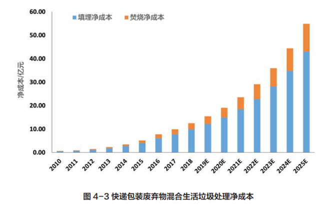 平均焚燒 1 噸快遞垃圾所需費(fèi)用 511 元,根據(jù)住建部發(fā)布的《中國城市建設(shè)統(tǒng)計(jì)年鑒》,2016 年我國生活垃圾填埋比例高達(dá) 60%,而焚燒比例為 38%,依此比例推算,2018 年快遞包裝焚燒量為 81.27 萬噸,處理費(fèi)用也增至 4.15 億元。雖然生活垃圾焚燒發(fā)電產(chǎn)生了部分經(jīng)濟(jì)效益,但效益遠(yuǎn)低于成本。2018 年垃圾焚燒效益雖達(dá)到 1.46 億元,但凈成本也增長到了 2.69 億。
