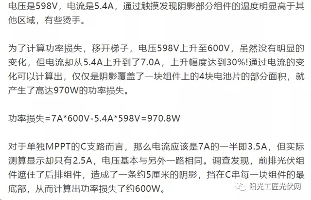 經(jīng)過勘探與計算得出該電站的功率因為兩處陰影導致?lián)p失高達1570W。除了功率損失之外,光伏系統(tǒng)中的陰影造成熱斑,長期如此,會加速組件老化,嚴重影響組件壽命。