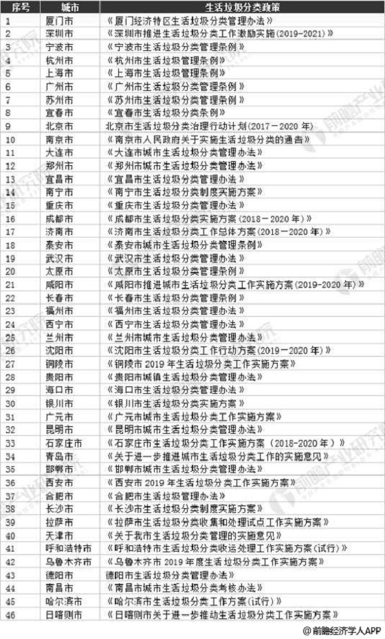 中國(guó)46個(gè)重點(diǎn)城市垃圾分類名單匯總情況