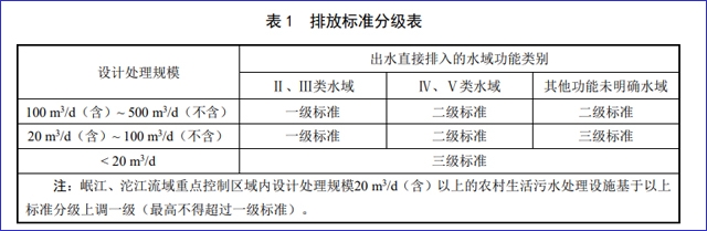 根據(jù)污水處理設(shè)施出水直接排入的水域功能類別和設(shè)計(jì)處理規(guī)模,將農(nóng)村生活污水處理設(shè)施水 污染物排放標(biāo)準(zhǔn)劃分為一級標(biāo)準(zhǔn)、二級標(biāo)準(zhǔn)和三級標(biāo)準(zhǔn),各級標(biāo)準(zhǔn)的適用情況見表1。其中,岷江、沱江流域重點(diǎn)控制區(qū)域內(nèi)(參見文末附件),設(shè)計(jì)處理規(guī)模20m³/d(含)以上的農(nóng)村生活污水處理設(shè)施對應(yīng)表1所列標(biāo)準(zhǔn)上調(diào)一級(最高不得超過一級標(biāo)準(zhǔn))。