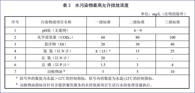 農(nóng)村生活污水經(jīng)處理后的水污染物,其最高允許排放濃度按表2規(guī)定執(zhí)行。尤為值得關(guān)注的是,《標(biāo)準(zhǔn)》對化學(xué)需氧量、氨氮等易致黑臭的耗氧性指標(biāo)加嚴(yán)控制,對實(shí)際運(yùn)行中確難去除的總氮、總磷適當(dāng)放寬要求。