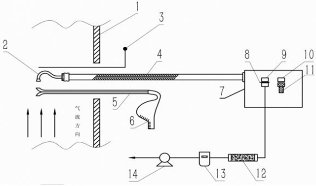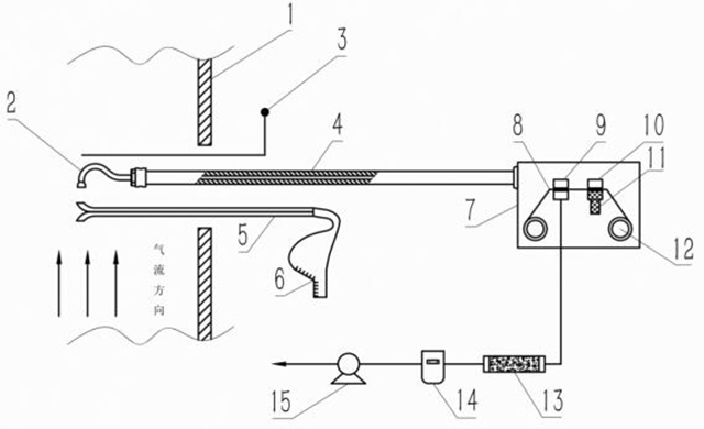 1-煙道壁;2-采樣嘴;3-溫度測(cè)量;4-采樣管;5-皮托管;6-壓力計(jì);