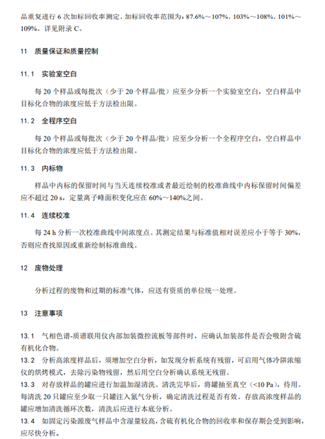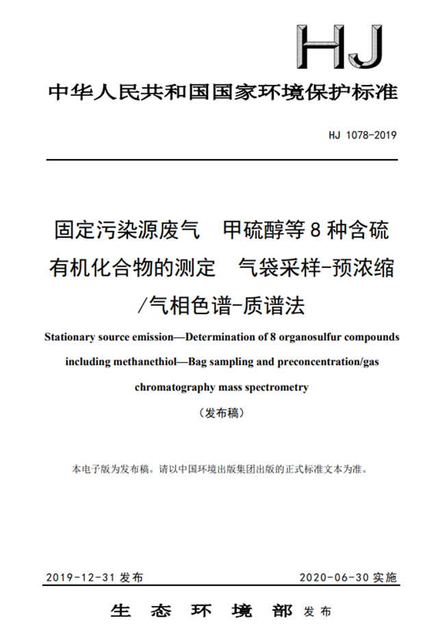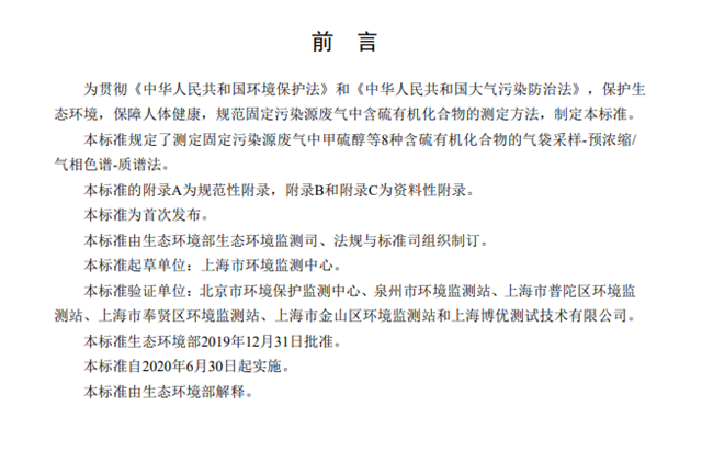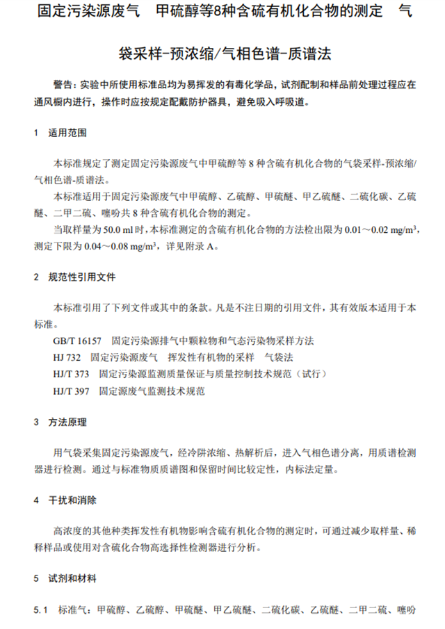 為貫徹《中華人民共和國(guó)環(huán)境保護(hù)法》和《中華人民共和國(guó)大氣污染防治法》,保護(hù)生態(tài)環(huán)境,保障人體健康,規(guī)范固定污染源廢氣中含硫有機(jī)化合物的測(cè)定方法,制定本標(biāo)準(zhǔn)。本標(biāo)準(zhǔn)規(guī)定了測(cè)定固定污染源廢氣中甲硫醇等8種含硫有機(jī)化合物的氣袋采樣-預(yù)濃縮/氣相色譜-質(zhì)譜法。本標(biāo)準(zhǔn)的附錄A為規(guī)范性附錄,附錄B和附錄C為資料性附錄。本標(biāo)準(zhǔn)為首次發(fā)布。