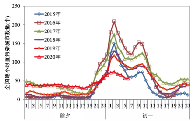 圖3 近六年除夕至初一全國逐小時重污染城市數(shù)量