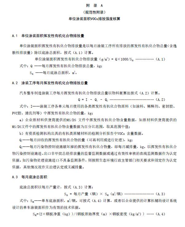 單位涂裝面積VOCs排放強(qiáng)度限值應(yīng)符合表4規(guī)定,計(jì)算方法按附錄A執(zhí)行,國(guó)家發(fā)布行業(yè)污染源源強(qiáng)核算標(biāo)準(zhǔn)后,依據(jù)國(guó)家源強(qiáng)核算標(biāo)準(zhǔn)進(jìn)行核算。