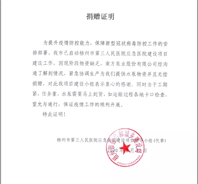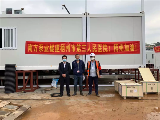 同時,2月中下旬,梧州市啟動第三人民醫(yī)院應急醫(yī)院建設項目建設工作,因現(xiàn)階段物資缺乏,南方泵業(yè)股份有限公司經(jīng)溝通了解到情況后,緊急協(xié)調(diào)生產(chǎn)為醫(yī)院提供水泵物資并且無償捐贈,由于工期緊,任務重,南方泵業(yè)積極協(xié)調(diào)生產(chǎn)及運輸,確保物資準時到位,保障醫(yī)院建設工作,保證疫情工作的順利開展。
