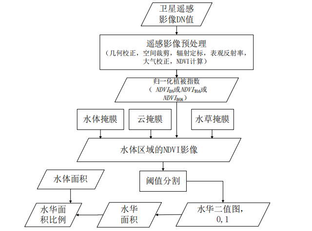 采用衛(wèi)星遙感影像數(shù)據(jù)開展水體的藍藻水華監(jiān)測,獲得水體中藍藻水華的空間分布位置,計算藍藻水華面積及其所占水體面積比例,據(jù)此評價水華程度。