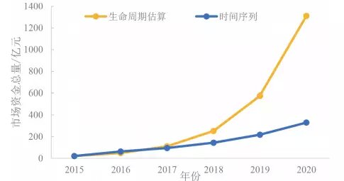 對于“十三五”期間土壤修復市場的預測,利用生命周期估算和時間序列法進行分析。根據生命周期估算法預測在整個“十三五”期間市場總額約為2297億元,是較為激進樂觀的情況;根據利用時間序列法預測“十三五”期間市場總額約為849億元,是相對保守的情況,如圖5所示。