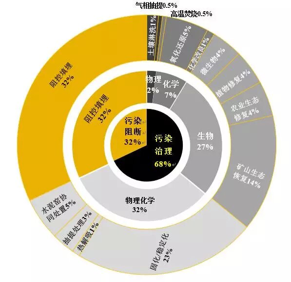 根據江蘇?。ㄒ伺d)環(huán)保產業(yè)技術研究院及土盟對公開招投標項目的統(tǒng)計調查發(fā)現,2008-2016年,我國177個土壤修復項目中,土壤修復以污染介質治理技術為主,占比68%;污染途徑阻斷技術占比32%。在污染介質治理技術中,物理化學和生物技術成為主要技術,分別占比32%和27%;物理、化學單一類技術應用占比相對較小,分別為2%和7%(圖 1)。