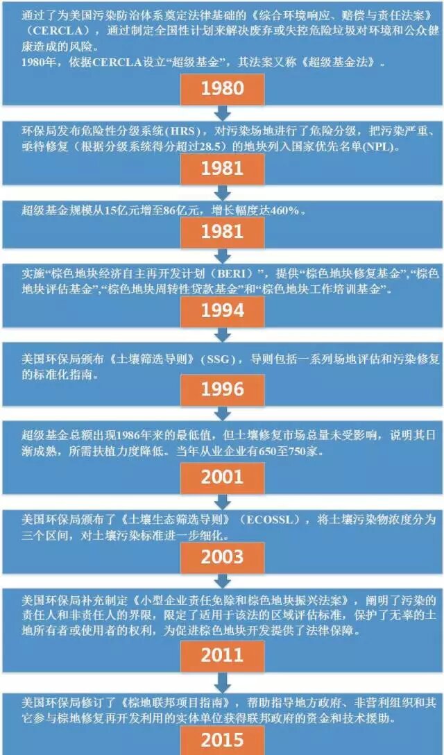 在全球范圍內,美國土壤修復產業(yè)起步最早,發(fā)展最快,其發(fā)展歷程和經驗值得各國學習借鑒。美國建立了完善的法律體系,包括歷經數次修訂的核心法案《超級基金法》,補充法案《小型企業(yè)責任免除和棕色地塊振興法案》,還有《固體廢物處置法》《清潔水法》《安全飲用水法》《有毒物質控制法》等輔助法案;美國有較為充足的資金支持,以超級基金為主要資金來源,以棕色地塊經濟自主再開發(fā)計劃(BERI)等為補充資金支持;美國制定了土壤篩選導則(SSG)和土壤生態(tài)篩選導則(ECO-SSL)在內的技術標準。