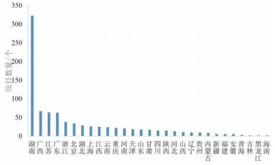 從目前所采集到的數據來看,已有29 個?。ㄗ灾螀^(qū)、直轄市)發(fā)布過土壤修復項目,如圖 4 所示。在發(fā)布項目的數量上,湖南、廣西、廣東、江蘇、浙江、北京各地較為領先,其中湖南省土壤修復項目數量居全國首位。