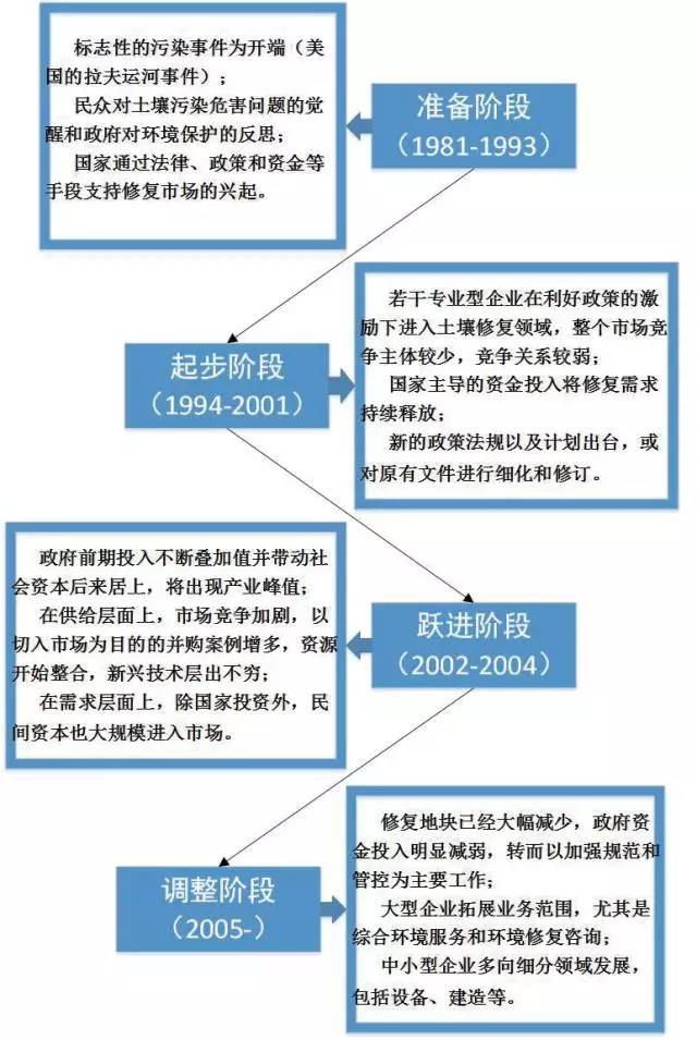 可以說,要想勾畫完整的土壤修復產業(yè)生命周期,經歷較為完全而且環(huán)保局數據齊全的美國是首選的分析對象,如圖 1 所示。