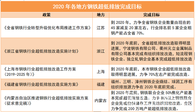 根據(jù)2019年印發(fā)的《關(guān)于推進(jìn)實(shí)施鋼鐵行業(yè)超低排放的意見》可知,到2020年,重點(diǎn)區(qū)域鋼企超低排放改造要力爭(zhēng)完成60%左右。在此推動(dòng)下,山東、江蘇、浙江、福建等多個(gè)地方積極響應(yīng),相繼發(fā)布的相關(guān)的政策或排放標(biāo)準(zhǔn),促進(jìn)鋼鐵企業(yè)綠色生產(chǎn)。