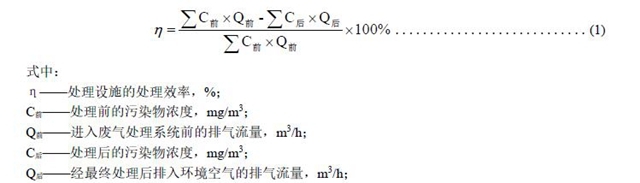 4.1.6 處理效率,指污染物控制設(shè)施去除污染物的量與處理前污染物的量之比,可通過同時(shí)測定處理前后廢氣中污染物的排放濃度和排氣量,以被去除的污染物與處理之前的污染物的質(zhì)量百分比計(jì),具體見(1)。