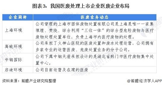 目前我國(guó)醫(yī)廢領(lǐng)域布局的企業(yè)較少,暫未形成激烈競(jìng)爭(zhēng)的局面,相關(guān)的上市公司有上海環(huán)境、高能環(huán)境、中鋼國(guó)際、啟迪環(huán)境等。以下是4家與疫情期間醫(yī)廢處理相關(guān)的上市公司的布局情況: