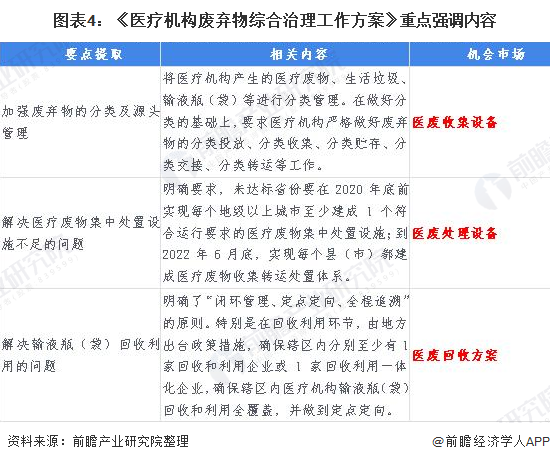 通過(guò)對(duì)該文件核心要點(diǎn)的解讀,可以看出未來(lái)與醫(yī)廢處理相關(guān)的醫(yī)廢處理設(shè)施、醫(yī)廢收集工具、醫(yī)廢回收利用方案等領(lǐng)域存在較大市場(chǎng)機(jī)會(huì)。