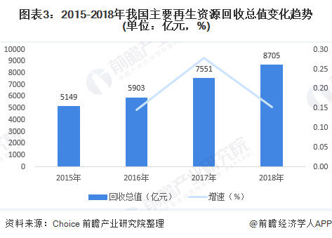 數(shù)據(jù)顯示,2018年,我國(guó)主要可再生資源的回收總量為3.22億噸,同比增長(zhǎng)14.23%;回收總值為8705億元,同比增長(zhǎng)15.28%。主要可再生資源包括:廢鋼鐵、廢有色金屬、廢塑料、廢紙、廢輪胎、廢棄電器電子產(chǎn)品、廢玻璃和廢電池等。2020年,預(yù)計(jì)我國(guó)主要再生資源回收量將突破3.5億噸。