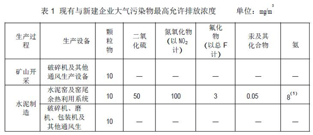對(duì)于無(wú)組織排放的控制,《標(biāo)準(zhǔn)》要求在物料處理、輸送、裝卸等過(guò)程要實(shí)行封閉,尤其是在車船裝卸過(guò)程中還要采取有效的抑塵措施,生產(chǎn)車間內(nèi)不得有可見的顆粒物排放存在。在《標(biāo)準(zhǔn)》實(shí)施之日起,水泥工業(yè)企業(yè)大氣污染物無(wú)組織排放濃度限制要按照下表執(zhí)行: