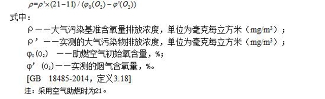 本標準規(guī)定的各項污染物濃度的排放限值,均指在標準狀態(tài)下以11%(V/V%)O2(干煙氣)作為換算基準換算后的基準氧量排放濃度,按下式進行換算: