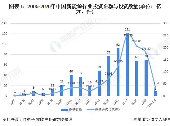 從新能源行業(yè)的投資規(guī)模來(lái)看,2005-2019年新能源行業(yè)投資金額呈現(xiàn)倒U型,2017年達(dá)到峰值254.25億元,2019年全年新能源行業(yè)的投資金額為176.27億元,同比下降14.78%,2020年1-3月中旬新能源行業(yè)的投資金額達(dá)到34.34億元。