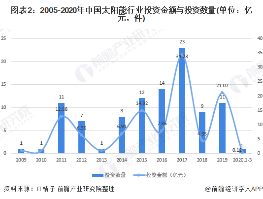 從太陽(yáng)能行業(yè)的投資規(guī)模來(lái)看,2009-2019年新能源行業(yè)投資金額呈現(xiàn)波動(dòng)變化,2017年達(dá)到峰值34.28億元,2019年全年太陽(yáng)能行業(yè)的投資金額為21.07億元,同比增長(zhǎng)384.37%,2020年1-3月中旬太陽(yáng)能行業(yè)的投資金額達(dá)到0.12億元。