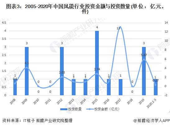 從風(fēng)能行業(yè)的投資事件數(shù)量來(lái)看,2005-2019年整體呈現(xiàn)波動(dòng)變化,2019年風(fēng)能行業(yè)的融資事件有3件,2020年1-3月中旬新能源行業(yè)融資事件數(shù)量有1件。