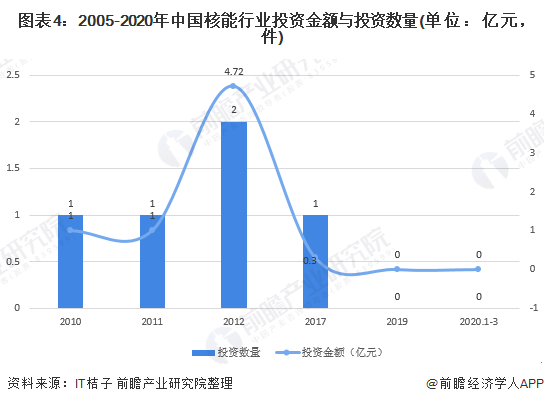 從核能行業(yè)的投資規(guī)模來(lái)看,2005-2019年核能行業(yè)投資金額呈現(xiàn)倒U型,2017年融資金額0.3億元,2019年全年核能的投資金額為0億元,2020年1-3月中旬核能行業(yè)的投資金額達(dá)到0億元。