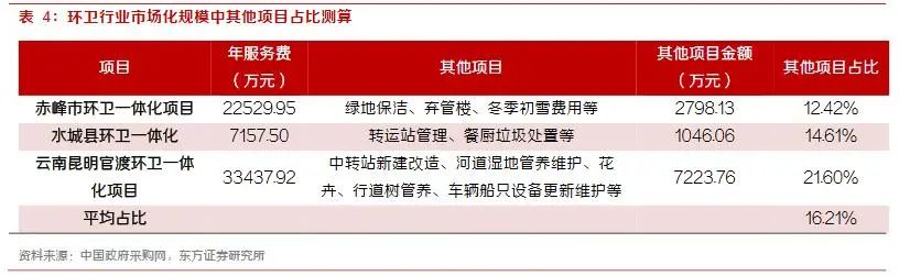 我們分別選取北京環(huán)境中標的赤峰市環(huán)衛(wèi)一體化項目、龍馬環(huán)衛(wèi)中標的水城縣環(huán)衛(wèi)一體化項目以及僑銀環(huán)保中標的云南昆明官渡環(huán)衛(wèi)一體化項目三個具有代表性的環(huán)衛(wèi)一體化項目,測算其中除前述環(huán)衛(wèi)項目外其他項目所占比例。根據(jù)各項目合同中列示的作業(yè)項目工作量及單價計算可得前述項目金額,總服務(wù)費減去前述項目服務(wù)費得到其他項目金額??紤]云南昆明官渡環(huán)衛(wèi)一體化項目總金額達67億元,體量較大所以包含服務(wù)范圍相對更廣,故假設(shè)市場化合同中其他項目所占比例略低于平均值即15%左右。