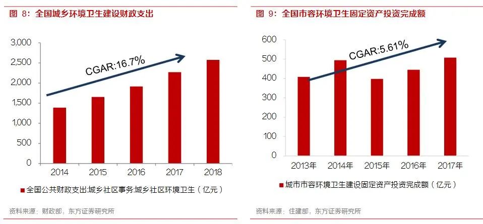 環(huán)衛(wèi)行業(yè)的收入來自于地方政府的環(huán)境衛(wèi)生建設(shè)的財政支出,2018年城鄉(xiāng)環(huán)境衛(wèi)生建設(shè)的財政支出達到2500億元,且過去三年保持16.7%左右的復(fù)合增速。城鎮(zhèn)化進程的深入,城市邊界的的延伸,城市垃圾清運和道路清掃的工作量會持續(xù)增長,環(huán)保要求的提高則推動了處理單價上漲,行業(yè)正在經(jīng)歷量和價值雙重提升的局面。
