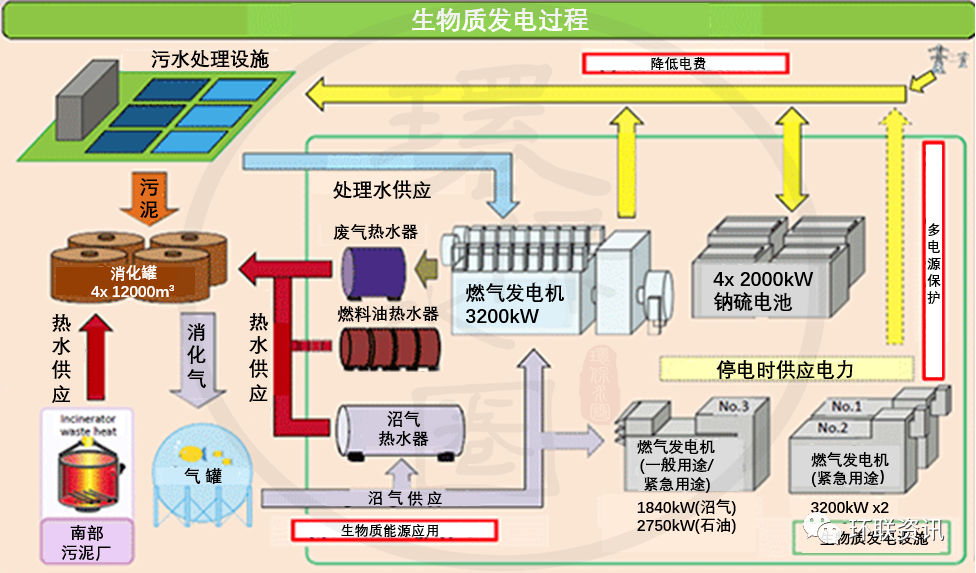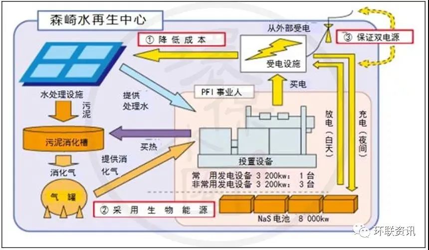 森崎水回收中心東部還設有有四個消化罐,用來從有機污泥成分中產(chǎn)生甲烷氣體,這將減少最終的污泥體積。每個消化罐內(nèi)徑28米,深度19.5米(容積12000立方米),消化溫度約為50攝氏度。為了構(gòu)建可持續(xù)發(fā)展和循環(huán)型社會,為下一代營造宜人的全球環(huán)境,森崎水回收中心正在努力利用污水處理過程中產(chǎn)生的能量,污泥和再生水來獲得資源和能源。夏季的廢水溫度低于夏季,冬季的溫度高于大氣溫度,“城市供熱”系統(tǒng)正是利用廢水溫差來實現(xiàn)區(qū)域供熱和制冷的。“城市供熱”系統(tǒng)的采用減少了化石燃料(石油,天然氣等)的使用,并有助于減少空氣污染物和電力消耗。將從水再生中心獲得的處理后的廢水供應到新的索尼公司大樓,以冷卻大樓的空調(diào)設備??照{(diào)產(chǎn)生的廢熱,通過熱交換器處理后被廢水吸收。該項目的環(huán)境影響是,由于冷卻設備運行所需的電力和自來水的減少,CO2排放量每年減少約22 t。此外,與將所有熱量釋放到大氣中的常規(guī)方法相比,該項目中的熱量釋放到處理后的廢水中,有助于應對熱島現(xiàn)象。 生物質(zhì)發(fā)電(與私營企業(yè)合作)廢水處理方法中產(chǎn)生的污泥在消化池中加熱,然后污泥中的有機物變成甲烷氣,減少了污泥量。過程中產(chǎn)生的甲烷是生物質(zhì)(可再生)能源,可以被用作發(fā)電設備的燃料,每年可發(fā)電22.8 kWh。在發(fā)電設施的安裝和管理方面,森崎率先引進了PFI(私人融資計劃:是一種公私合作的方法,將資金、技術(shù)知識和管理技能從私營部門帶到公共機構(gòu)),它可以降低設施建設或維護/管理的成本。它也通過可交易的綠色證書作為環(huán)境價值能源轉(zhuǎn)讓給第三方。該中心還安裝了世界上最大的NaS電池設備,用于全天的分布式電力負載:在夜間有效地使用低成本的電力,并在用電高峰期減少使用電池供電。