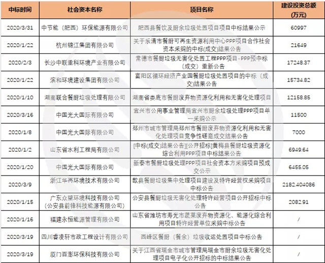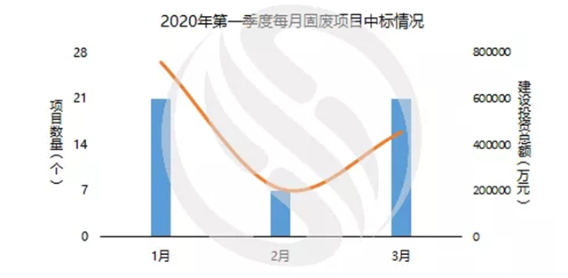 2020的四分之一已過(guò),E20研究院數(shù)據(jù)中心對(duì)第一季度固廢市場(chǎng)進(jìn)行盤(pán)點(diǎn):(1)從E標(biāo)通獲悉,2020年第一季度社會(huì)資本共計(jì)中標(biāo)49個(gè)固廢投資運(yùn)營(yíng)項(xiàng)目,投資總額超142億元。(2)1-3月固廢項(xiàng)目中標(biāo)趨勢(shì)呈現(xiàn)出“√”型曲線,2月部分項(xiàng)目受疫情影響導(dǎo)致延期或停滯,中標(biāo)項(xiàng)目數(shù)量?jī)H個(gè)位數(shù),3月隨著疫情得到有效控制出現(xiàn)回升態(tài)勢(shì)。(3)焚燒市場(chǎng)釋放投資額超106億元,與2019年同期相比,投資額同比上漲15.4%,項(xiàng)目數(shù)量與日處理能力較同期持平;焚燒市場(chǎng)依舊延續(xù)歷史趨勢(shì),向四五線城市下沉。民企社會(huì)資本中康恒環(huán)境表現(xiàn)不俗,共計(jì)中標(biāo)6個(gè)項(xiàng)目。(4)第一季度,(含)餐廚/廚余處理處置項(xiàng)目共計(jì)成交16個(gè),8成項(xiàng)目落定長(zhǎng)江經(jīng)濟(jì)帶地區(qū)。(5)建筑垃圾處置市場(chǎng)同樣值得關(guān)注,一季度數(shù)據(jù)中心從E標(biāo)通獲悉建筑垃圾處置項(xiàng)目8個(gè),75%的項(xiàng)目中標(biāo)地為華東地區(qū)。(6)除上述細(xì)分領(lǐng)域外,生物質(zhì)發(fā)電、畜禽糞污等其他細(xì)分領(lǐng)域文中均有涉及,詳見(jiàn)正文。