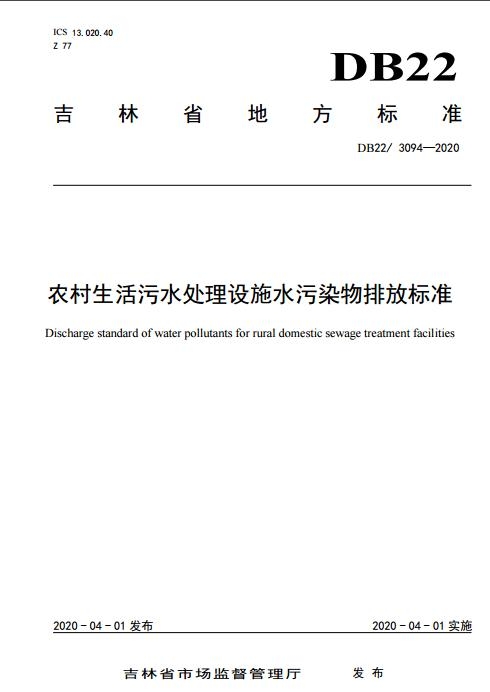 4月1日,經(jīng)吉林省人民政府批準,吉林省生態(tài)環(huán)境廳聯(lián)合省市場監(jiān)督管理廳發(fā)布吉林省《農(nóng)村生活污水處理設施水污染物排放標準》(DB22/3094——2020),此文件屬于地方性強制標準,并于2020年4月1日實施。