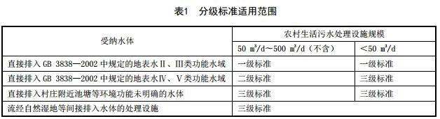 4.1.2 規(guī)模<500 m³/d 的農(nóng)村生活污水處理設施水污染物排放分為一級標準、二級標準和三級標準,分級標準適用范圍見表1。