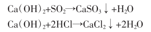 半干法是通過噴水量控制反應溫度,在合適的溫度消石灰漿液與酸性氣體反應,脫除煙氣中的酸性成分。旋轉(zhuǎn)噴霧半干法將石灰漿液通過塔頂?shù)母咿D(zhuǎn)速旋轉(zhuǎn)霧化器進行霧化,石灰漿液被霧化成粒徑30um~50um左右的霧滴,細小的霧滴與酸性氣體充分接觸,在一系列的化學反應后去除煙氣中絕大多數(shù)的酸性氣體;在反應過程中,霧滴吸收煙氣中的熱量不斷蒸發(fā)水分,結(jié)合脫酸塔的獨特設計,塔內(nèi)的高溫煙氣使得漿液霧滴在下降的過程中得到干燥,并在到達塔底前將水分充分蒸發(fā),形成固體反應物從塔底排出。其化學反應如下: