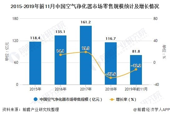 霧霾是空氣凈化器爆發(fā)的催化劑,卻也讓空凈市場(chǎng)滑入悲哀之境。當(dāng)大氣治理工作展開后,空氣質(zhì)量的明顯好轉(zhuǎn)也致使空氣凈化器市場(chǎng)發(fā)展開始“掉頭”。2018年空氣凈化器市場(chǎng)還是下滑,這一趨勢(shì)在2019年仍未得到改善。根據(jù)奧維云網(wǎng)公布的監(jiān)測(cè)數(shù)據(jù)顯示,2018年我國空氣凈化器零售額為116.7億元,大幅下降,同比下降27.6%,截至2019年11月,我國空氣凈化器零售總額為81.8億元,同比下降12.2%。