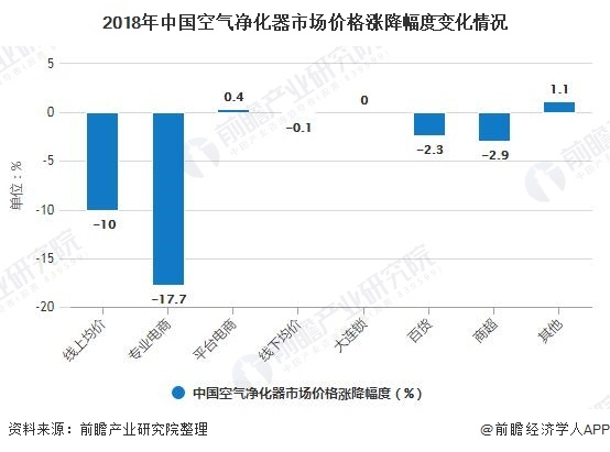 3、中國空氣凈化器市場(chǎng)價(jià)格下降,線上渠道降價(jià)明顯