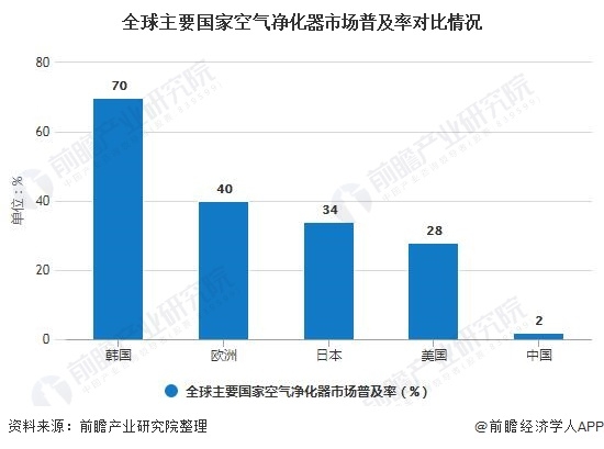 目前,發(fā)達(dá)國家空氣凈化器的普及率遠(yuǎn)高于發(fā)展中國家,其中韓國的普及率達(dá)到了70%,歐洲空氣凈化器的普及率為40%,美國空氣凈化器的普及率為28%,日本空氣凈化器的普及率為34%,而中國的空氣質(zhì)量遠(yuǎn)不及上述國家,空氣凈化器的普及率卻僅有2%。因此我國空氣凈化器市場(chǎng)潛力巨大,作為功能性較強(qiáng)的產(chǎn)品,空氣凈化器不斷拓展產(chǎn)品功能和質(zhì)量,未來行業(yè)有望向智能化和功能創(chuàng)新化方向發(fā)展。