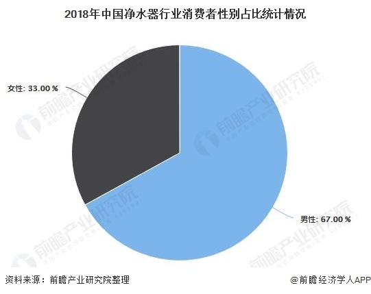 根據(jù)奧維網(wǎng)數(shù)據(jù)顯示,2018年,在我國凈水器行業(yè)中有67%的消費(fèi)者為男性客戶,僅有33%的消費(fèi)者為女性客戶??梢钥闯?,我國男性對(duì)于凈水器消費(fèi)更加偏愛。