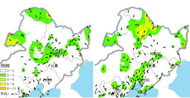 4月13日8時(shí)(左)和20時(shí)(右)東北地區(qū)風(fēng)場實(shí)況
