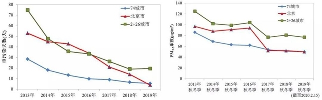 就在剛剛過(guò)去的2019–2020年秋冬季,三大重點(diǎn)區(qū)域空氣質(zhì)量繼續(xù)改善,“2+26”城市PM2.5平均濃度同比下降13.6%,重污染天數(shù)同比減少36.2%,長(zhǎng)三角地區(qū)和汾渭平原也都完成了既定的空氣質(zhì)量改善目標(biāo)。2019年,北京市PM2.5年均濃度更是達(dá)到42微克/立方米的歷史低值;重污染天數(shù)僅4天,相比2016年減少近90%。