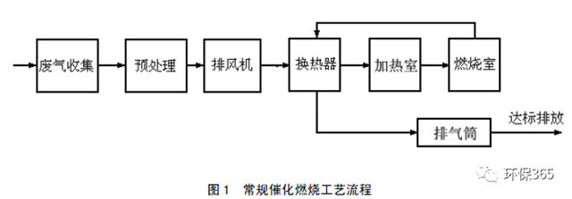 根據對廢氣加熱方式的不同,催化燃燒工藝可以分為常規(guī)催化燃燒工藝(見圖 1)和蓄熱催化燃燒工藝(見圖 2)。