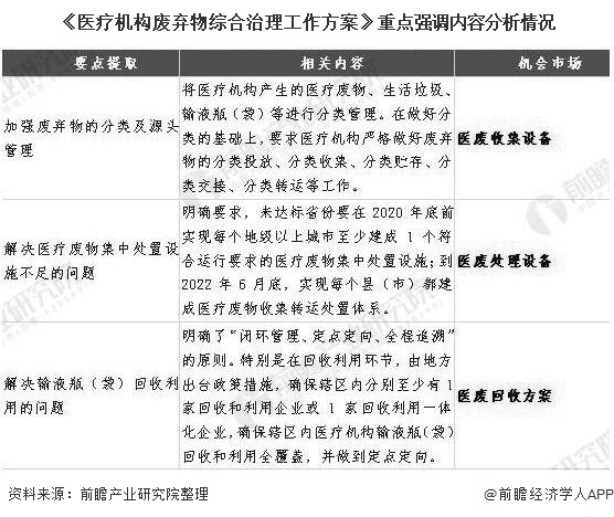 通過(guò)對(duì)該文件核心要點(diǎn)的解讀,可以看出未來(lái)與醫(yī)廢處理相關(guān)的醫(yī)廢處理設(shè)施、醫(yī)廢收集工具、醫(yī)廢回收利用方案等領(lǐng)域存在較大市場(chǎng)機(jī)會(huì)。